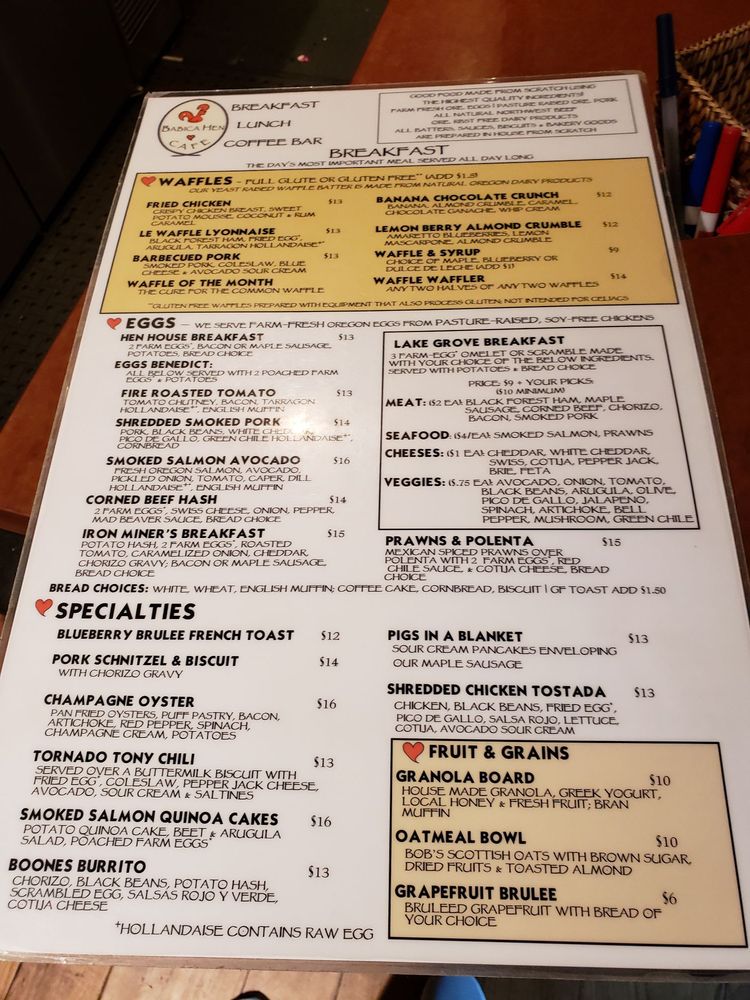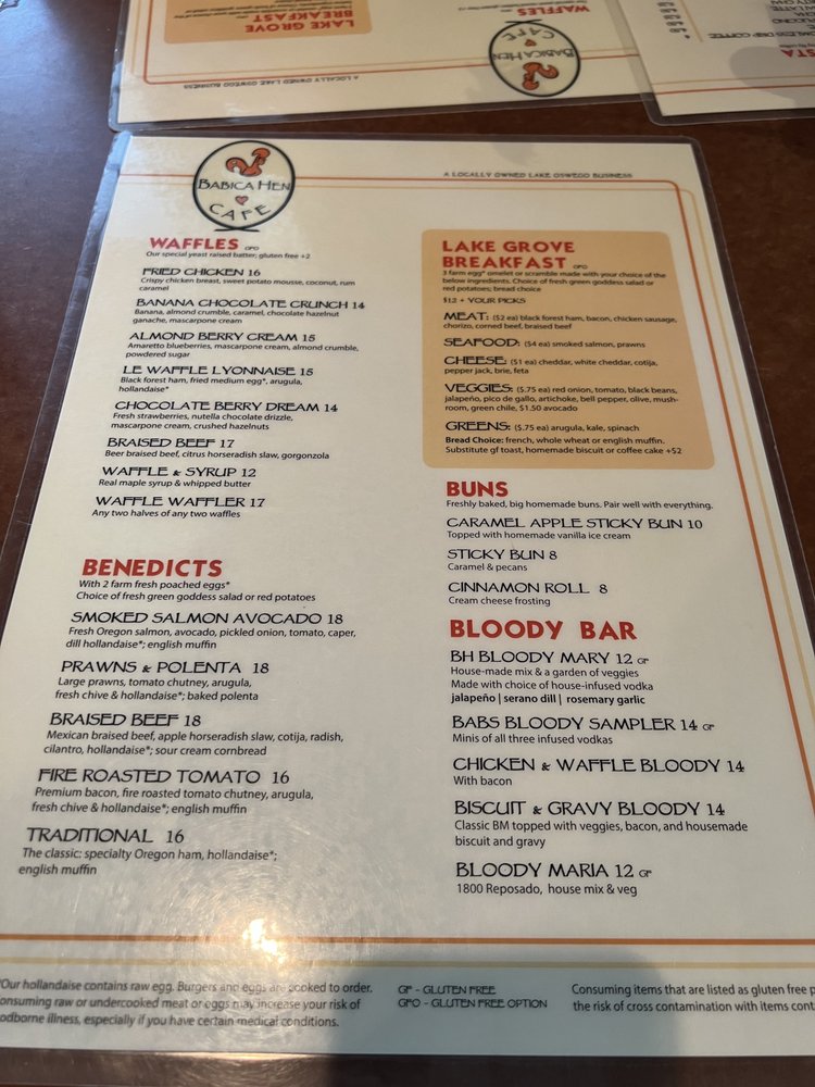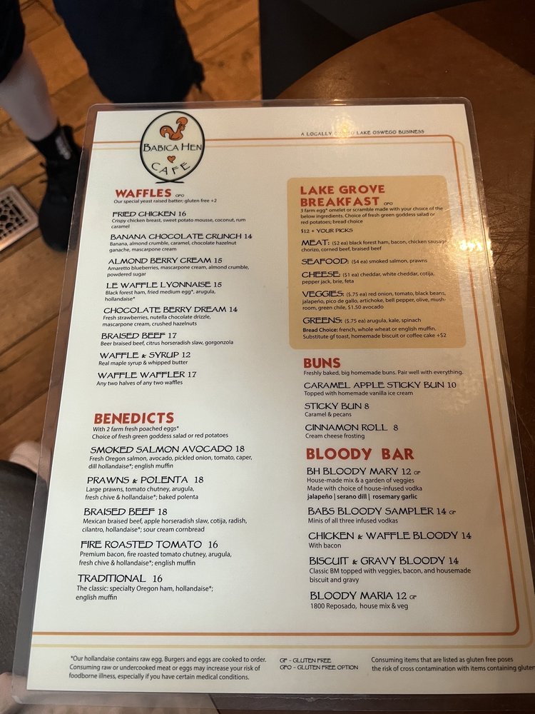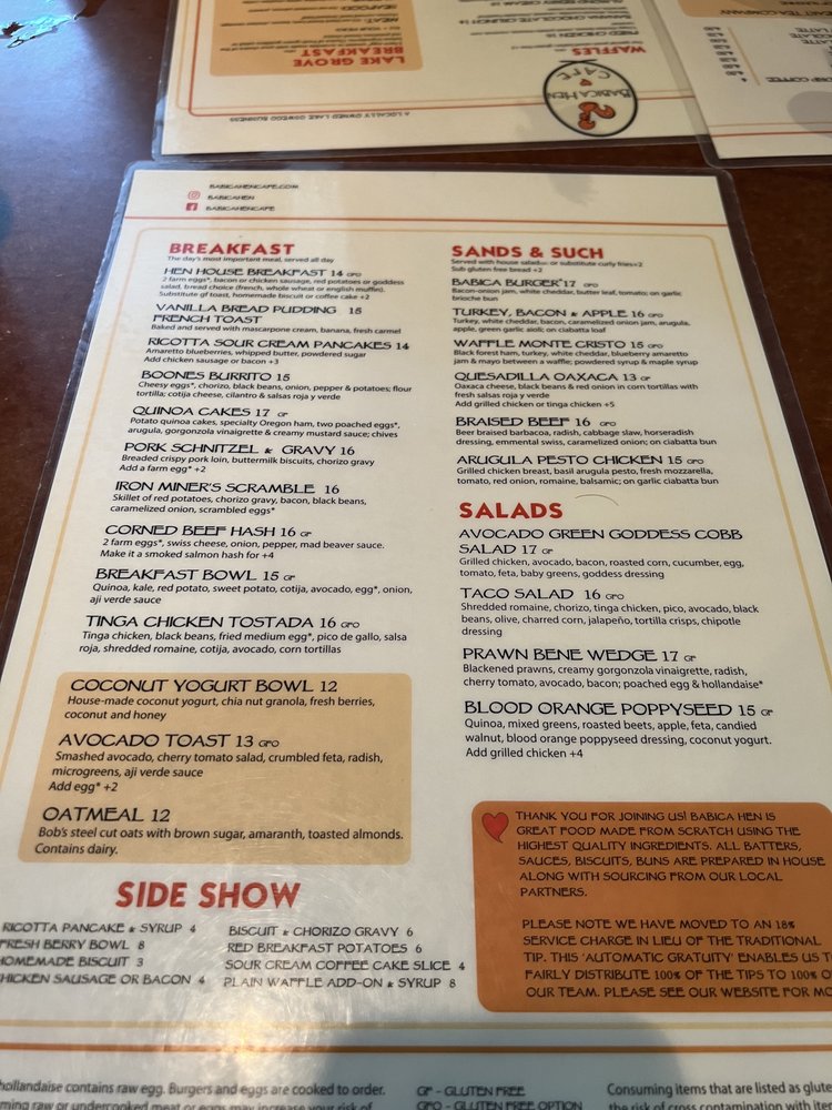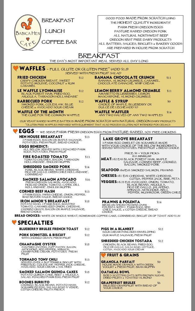 Introducing the menu at Babica Hen Cafe, a cozy spot in Lake Oswego offering coffee, tea, breakfast, brunch, and sandwiches. With a range of options like the Banana Chocolate Crunch Waffle, Traditional Benedict, and Corned Beef Hash, this cafe caters to various tastes. Customers rave about the incredible service and energy of the staff. Reviews highlight must-try items like the Almond Berry Cream waffle and the Smoked Salmon Avocado Benedict. While there may be a wait during peak hours, the quality of the food makes it worth it. The lemon poppyseed waffles and avocado toast receive high praise for their delicious flavors and generous portions. Overall, Babica Hen Cafe stands out for its diverse menu, attentive service, and vibrant atmosphere.